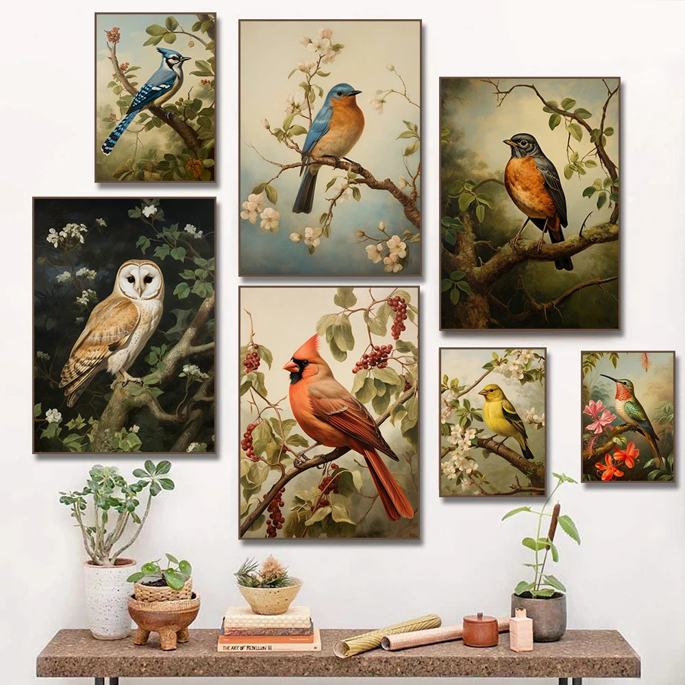 Antique Cardinal Blue Bird Goldfinch Hummingbird Robin Owl Poster Canvas Painting Print for Living Room Home Decoration Cuadros