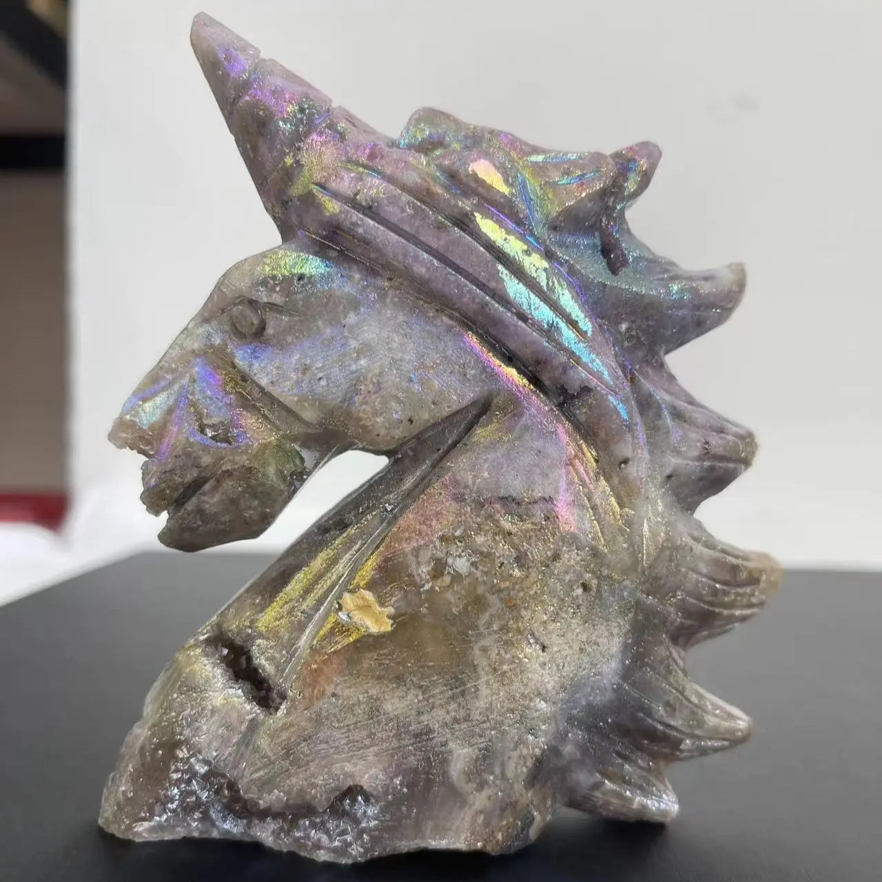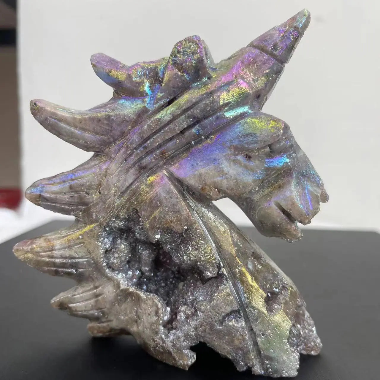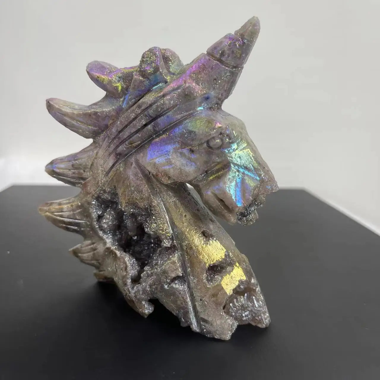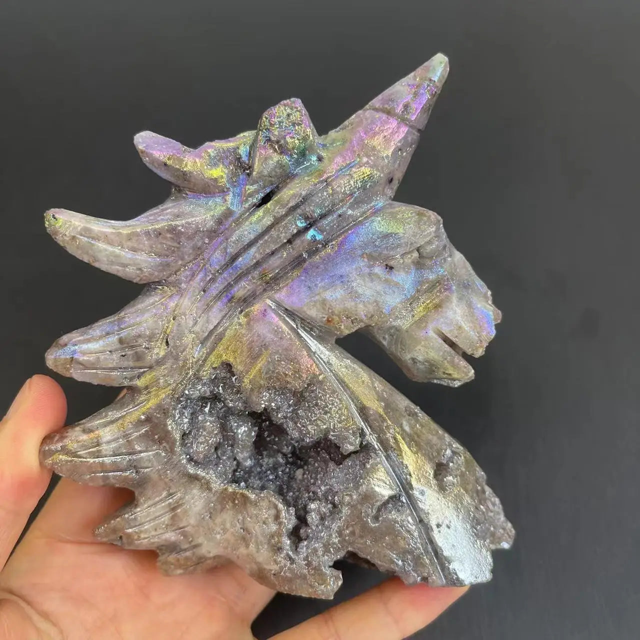 Hight About 11-12cm Natural Crystal Plating Color Unicorn Sphalerite Drusy Hand-Carved Statue Reiki Healing Gem