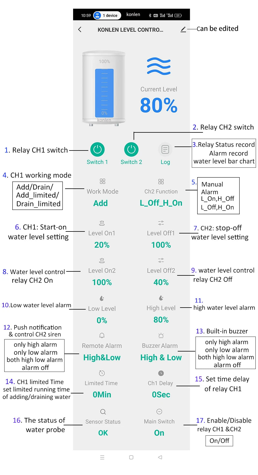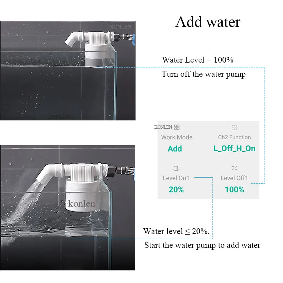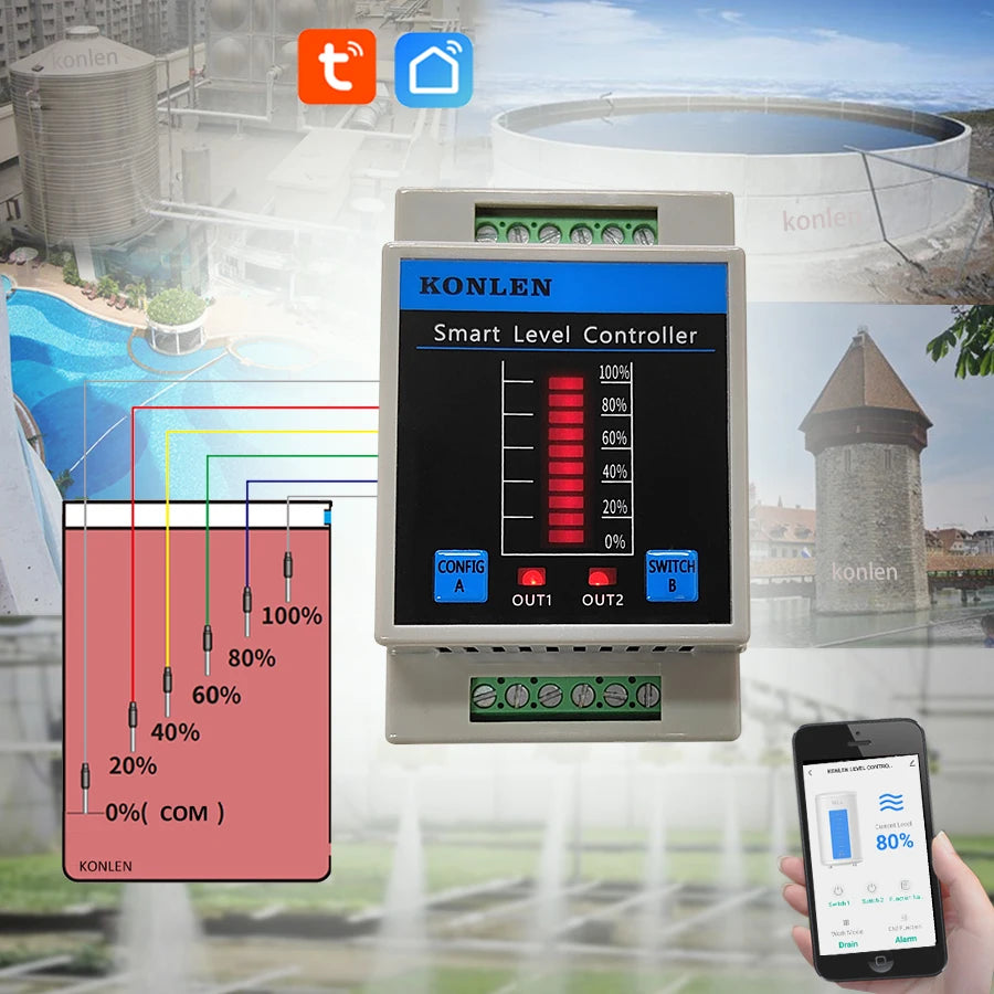 KONLEN Water Level Sensor Tuya WIFI Tank Boiler Level Controller Pool Shower Flow Monitor Smart Life Flood Leak Alarm Detector