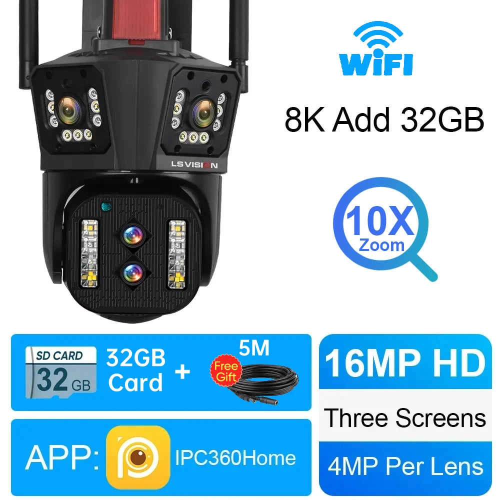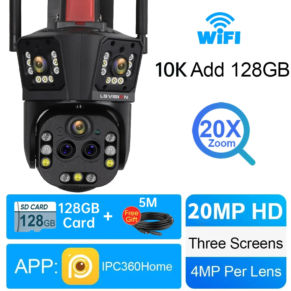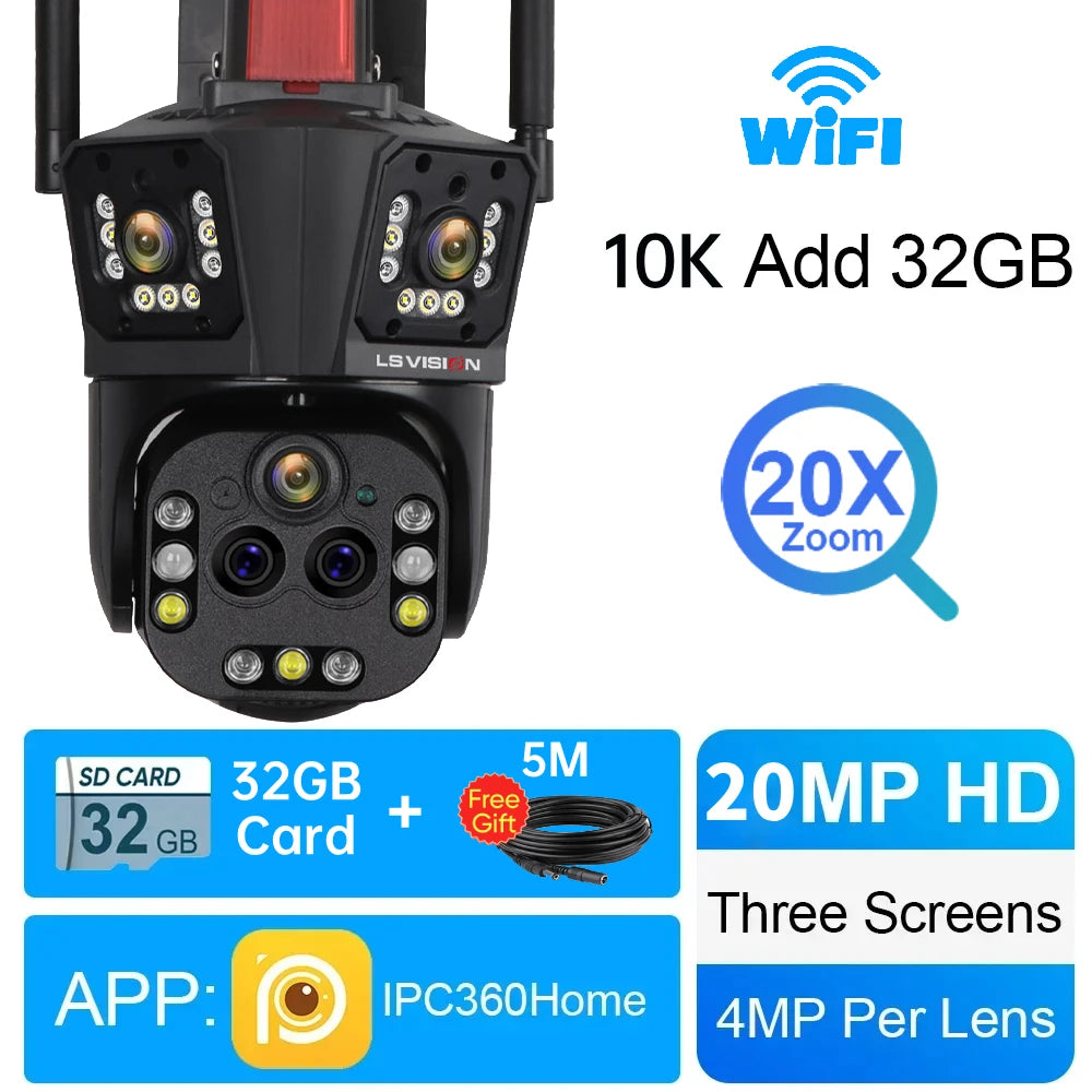 LS VISION 10K 20MP WiFi IP Camera Five Lens 20X Zoom Outdoor 360° Surveillance Security Camera Smart Home Ai Tracking CCTV Cam